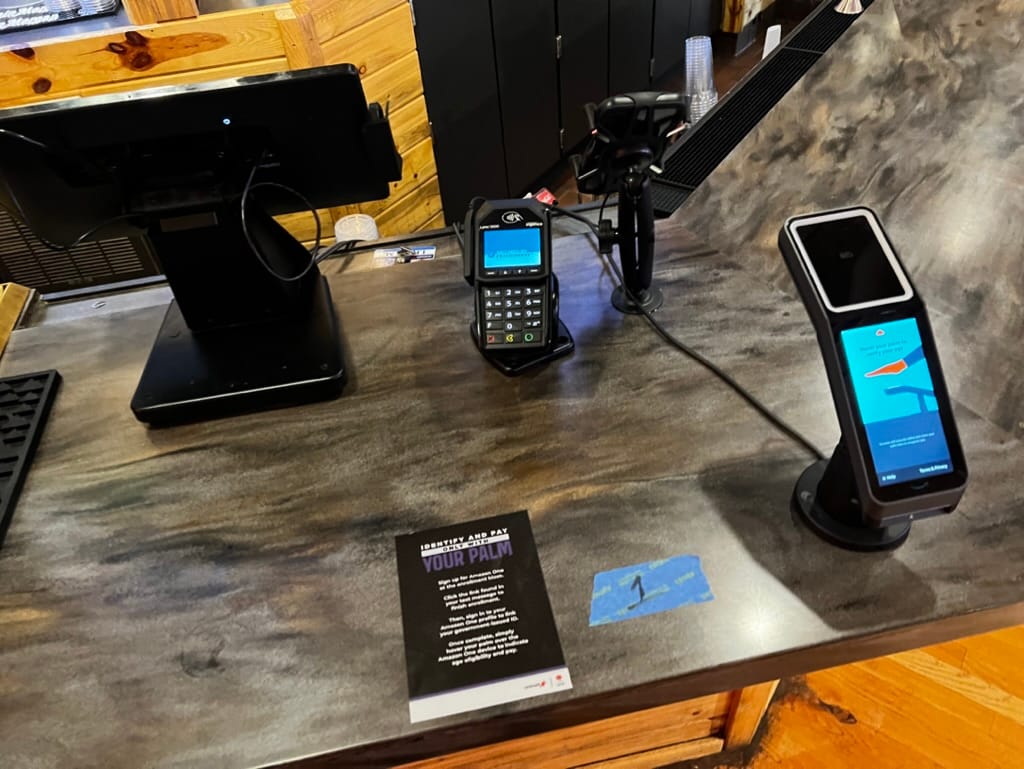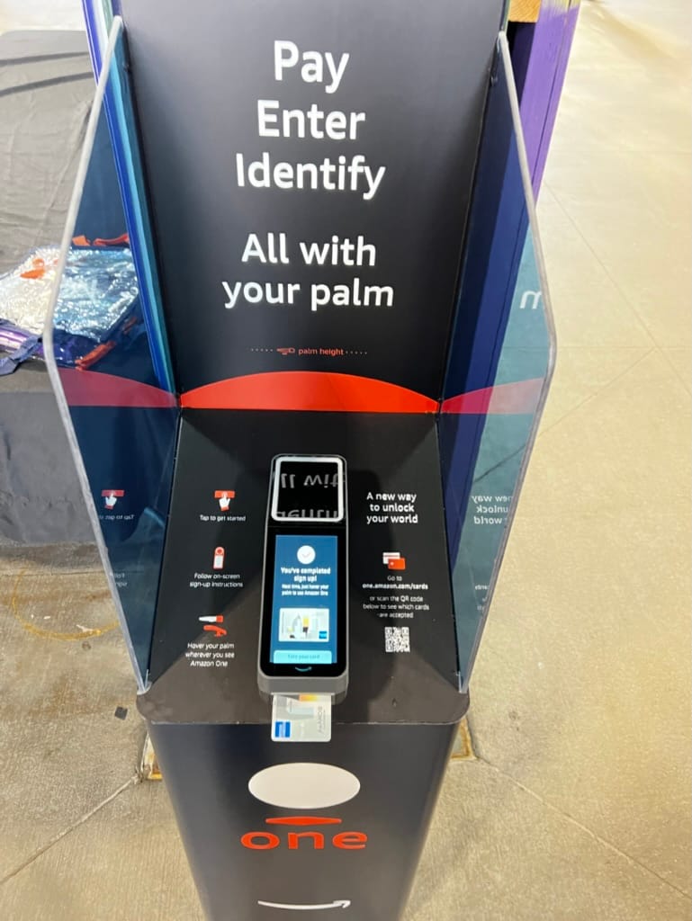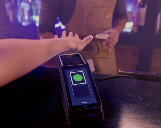 2. Once enrolled, fans can hover their palm over the Amazon One device to confirm their age and pay—no wallet or ID check required.